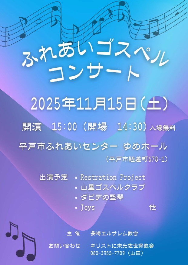 ♪平戸市紐差町でコンサートがあります。↑↑↑↑↑【2025年11月15日】♪ ♪The Vision所属のゴスペルグループをメインにしたテレワーク動画 ♪コロナに勝つ! テレワーク みんなで歌おう! I rejoice in the rord。 ♪東京のゴスペルチームとコラボで開催したチトセピアホールでのコンサート。「イエス」はこちらから。 Amazing Grace ,Victors Crownもどうぞ! ♪山里ゴスペルクラブベストヒット1に収録されている「永遠の愛」が、 |